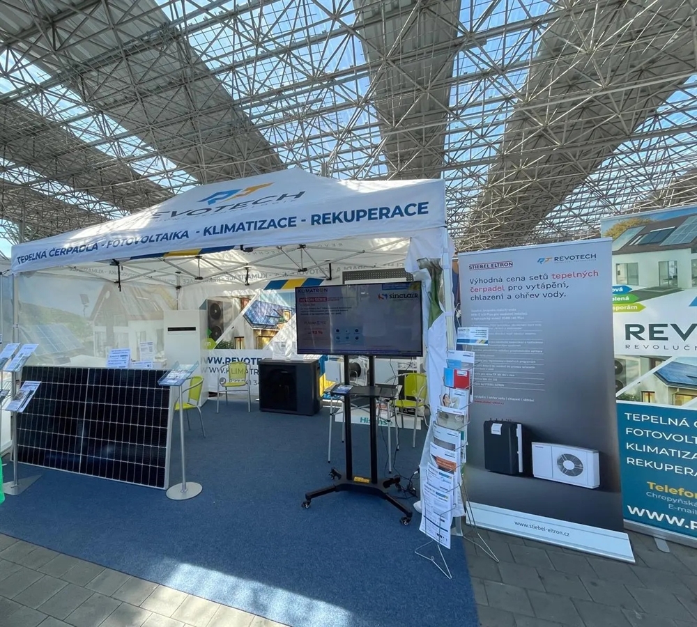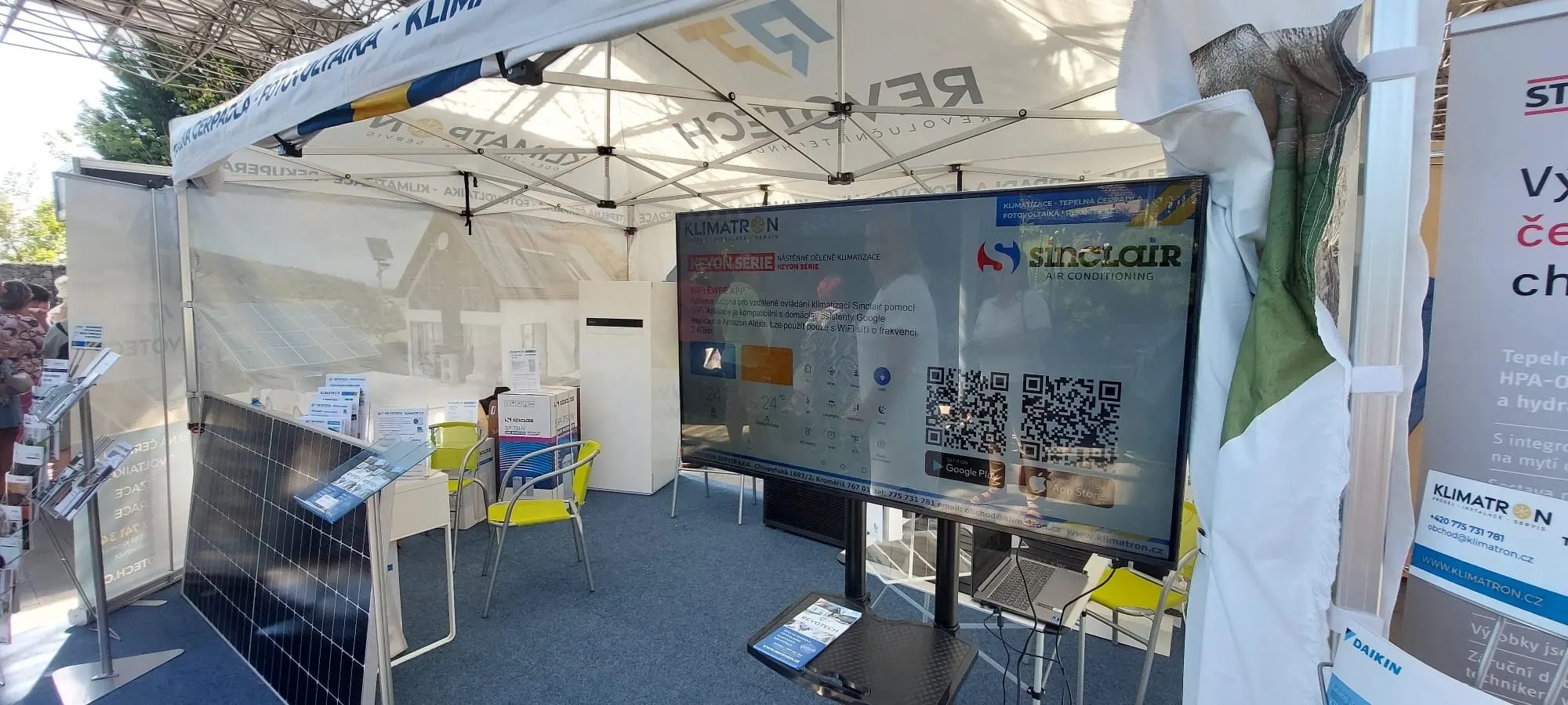 Na stánku si zájemci mohou prohlédnout vystavené modely klimatizací, tepelné čerpadlo i fotovoltaický panel.